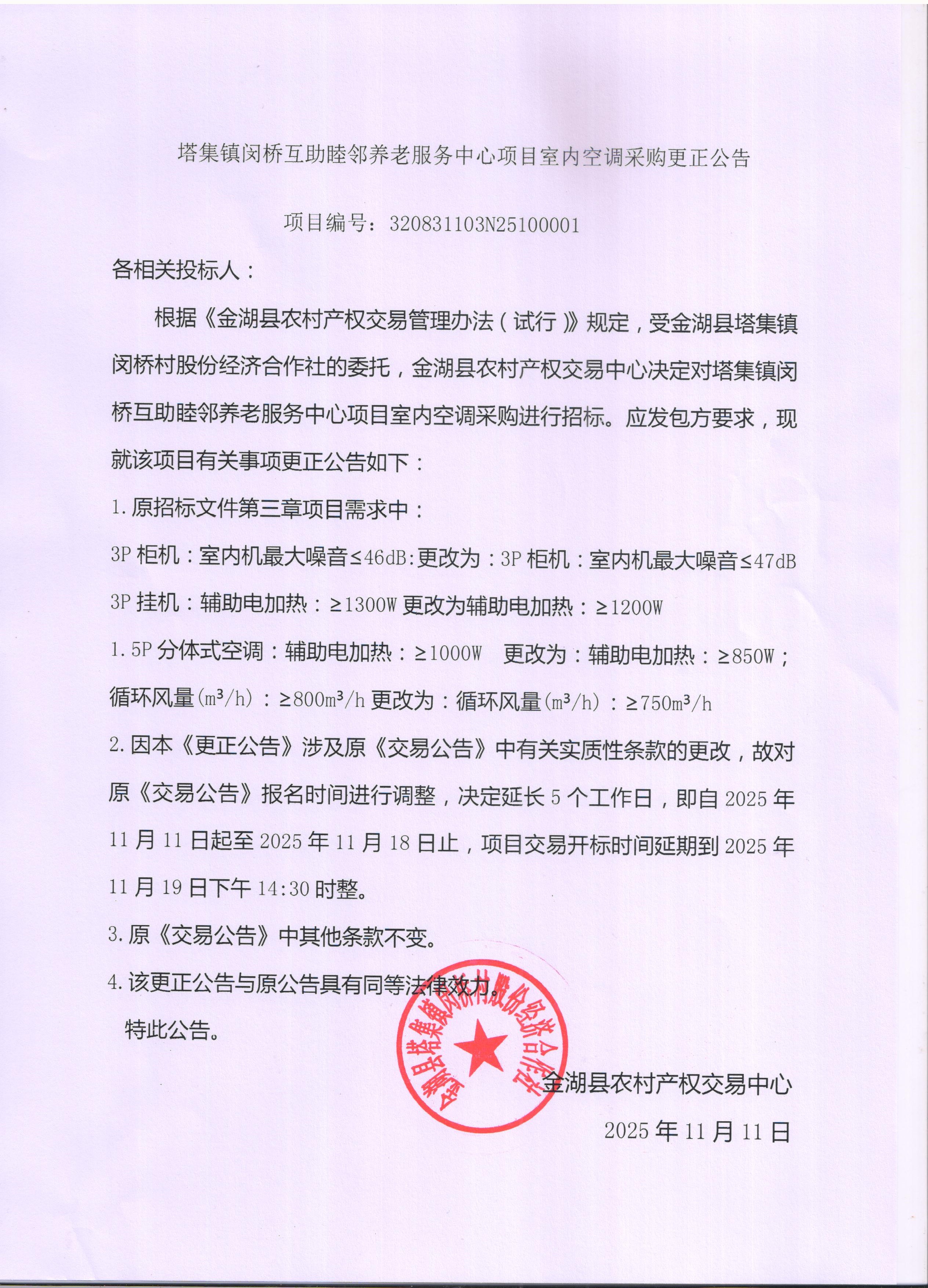 塔集镇闵桥互助睦邻养老服务中心项目室内空调采购更正公告