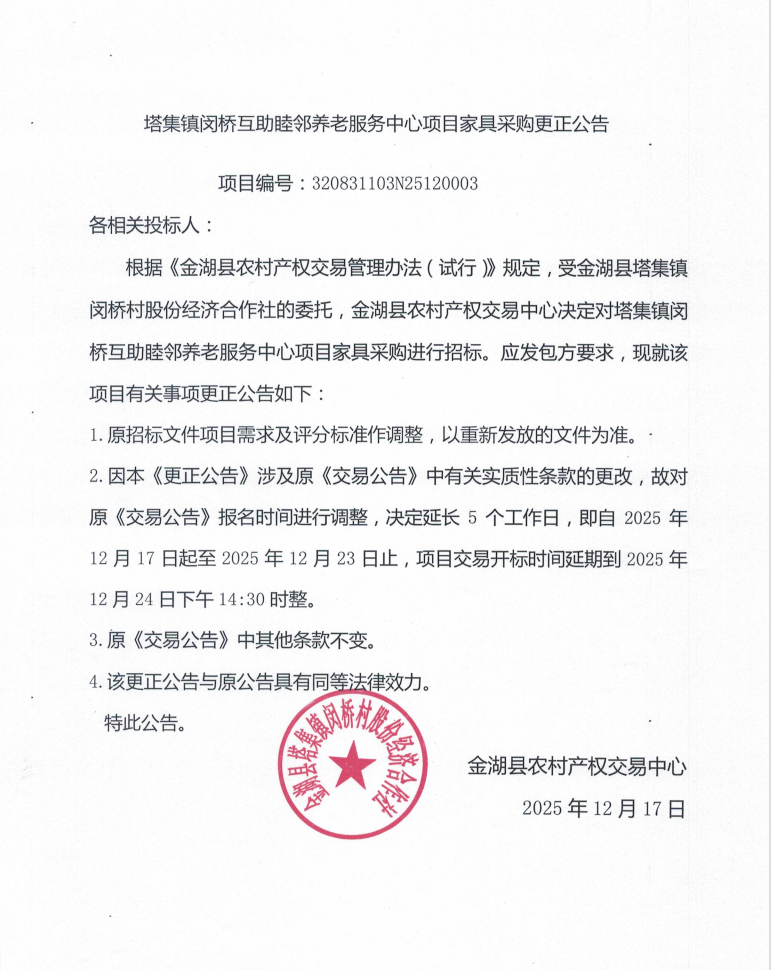 塔集镇闵桥互助睦邻养老服务中心项目家具采购更正公告